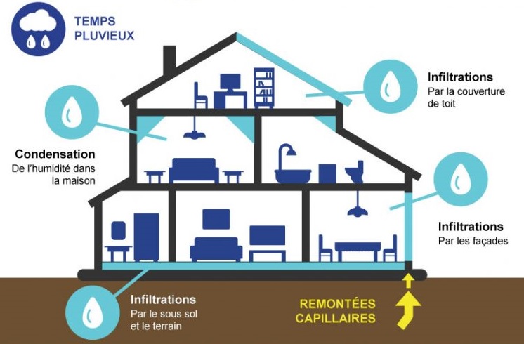 Si l’humidité s’infiltre dans l’habitation, les murs intérieurs risquent aussi d’être affectés. De plus, c’est également un risque pour la santé des occupants. En effet, l’humidité dans la maison peut causer des problèmes respiratoires et amplifier les symptômes de l’asthme et des rhumatismes.